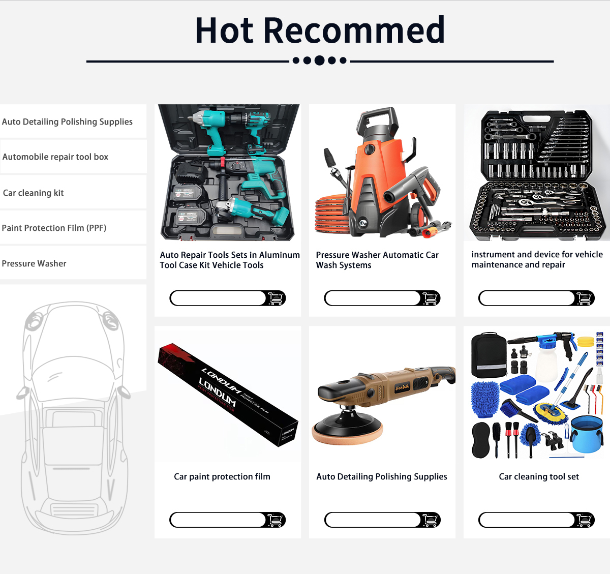 Productos principales:Lavadora de coches de alta presión, Herramientas de limpieza y cuidado, película protectora de automóviles, juego de herramientas de mantenimiento de automóviles, llave eléctrica